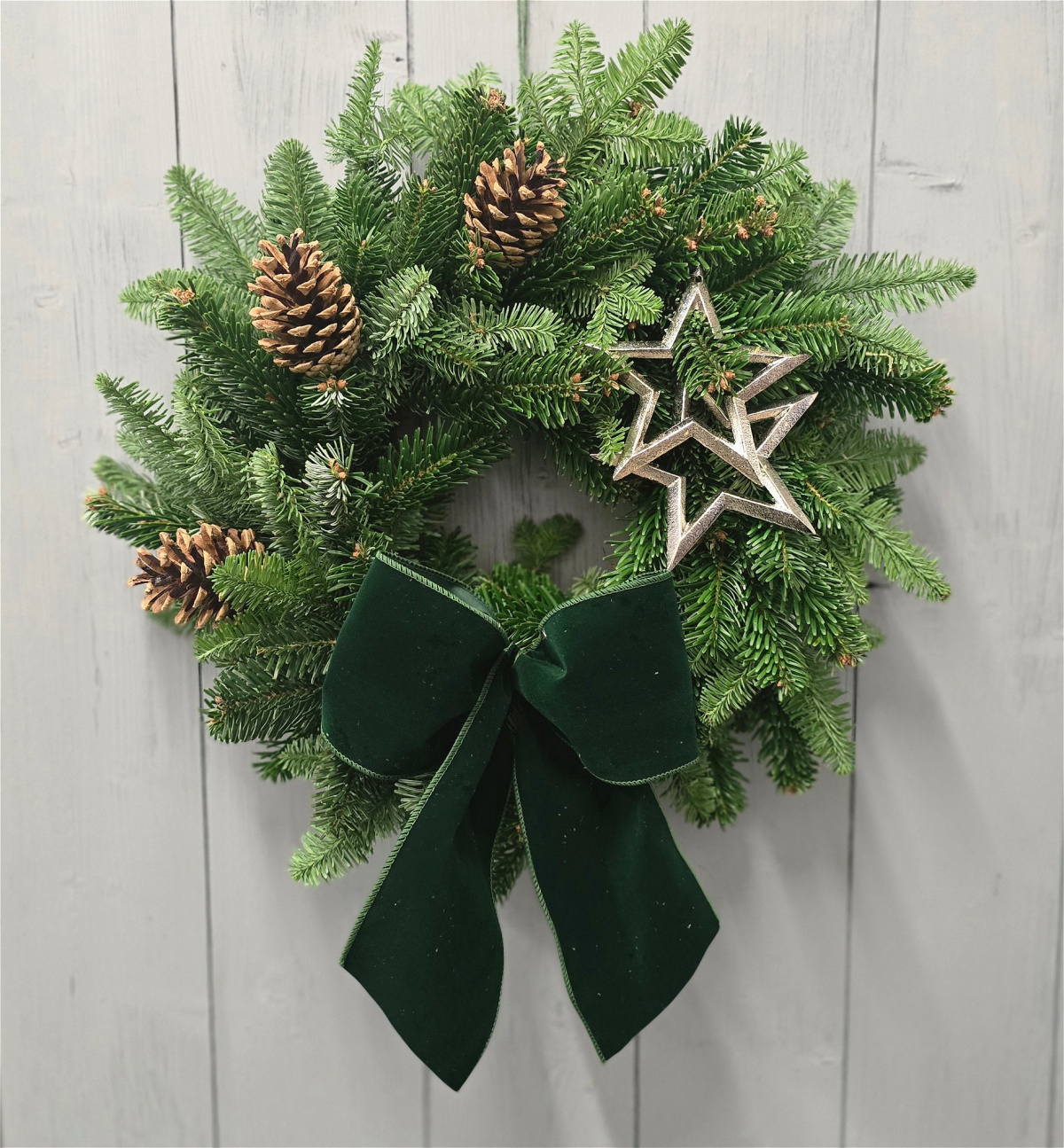 Pine wreath made on a moss filled 10 inch ring. Decorated with two silver decorative stars, pine cones and green ribbon.