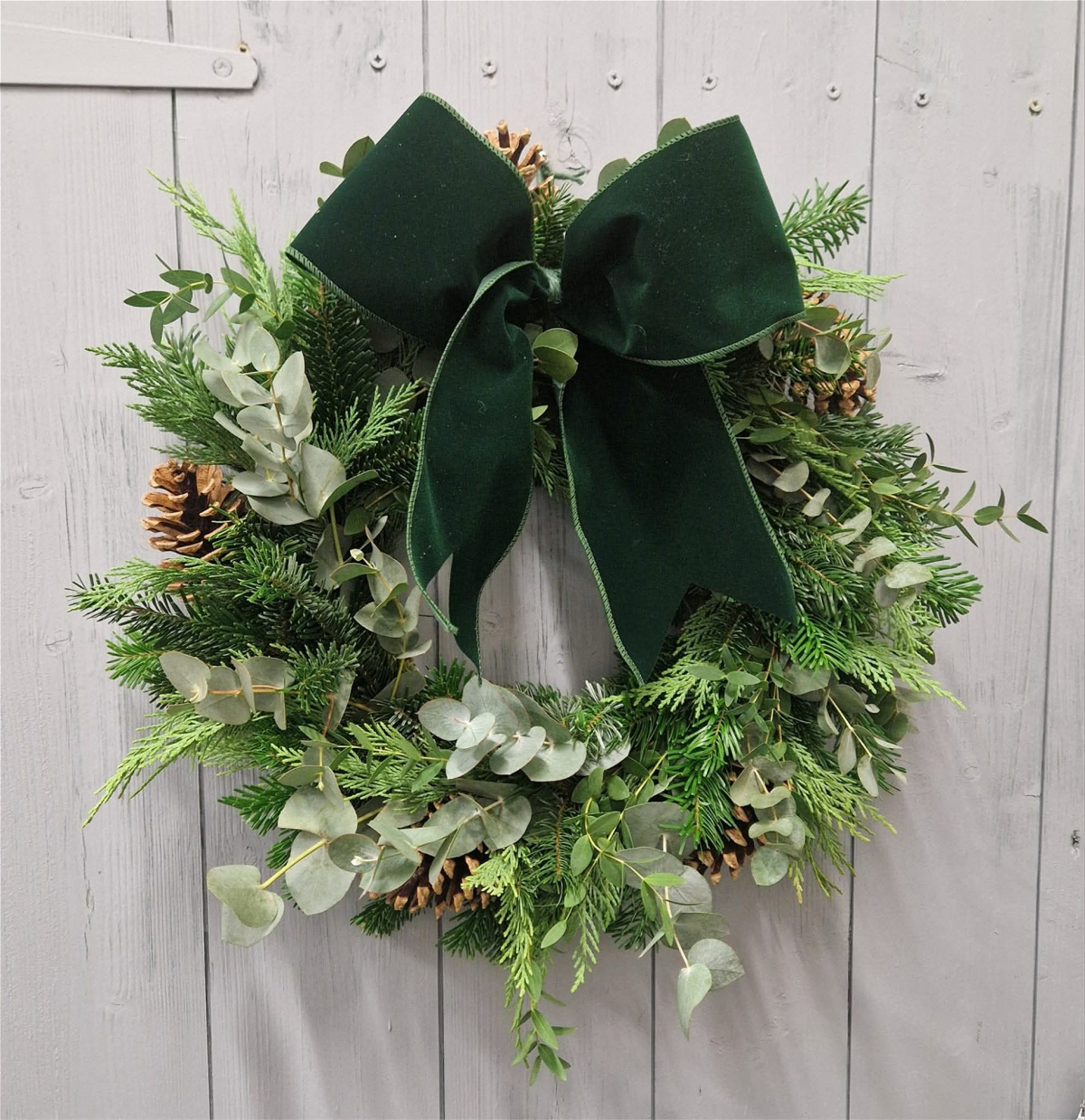 12"wreath ring filled with fresh moss, decorated with pine, leylandii, eucalyptus etc and finished with pine cones and velvet bow.